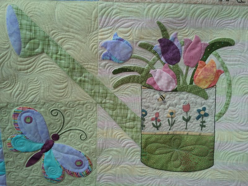 As quilters, most of us want our spools of thread sitting in nice, neat, even rows. But it's when that one spool falls off the rack and begins unwinding that we find some of our most wonderful creations. And so it is, with the last spool (bottom row on the right) on Margaret's qult...the unwinding thread leads to a beautiful vine of leaves and floral elements.